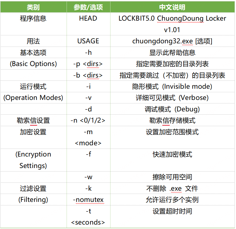 LockBit 5.0支持使用命令行參數(shù)來執(zhí)行不同的加密功能,參數(shù)如下: